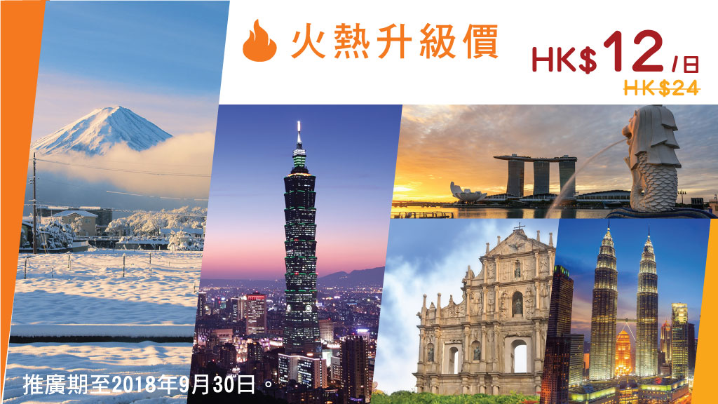 6大旅遊熱點:日本、台灣、澳門、新加坡、馬來西亞及印尼,數據日費只需12蚊。每日每地區4G漫遊數據用量更提升到 500MB。