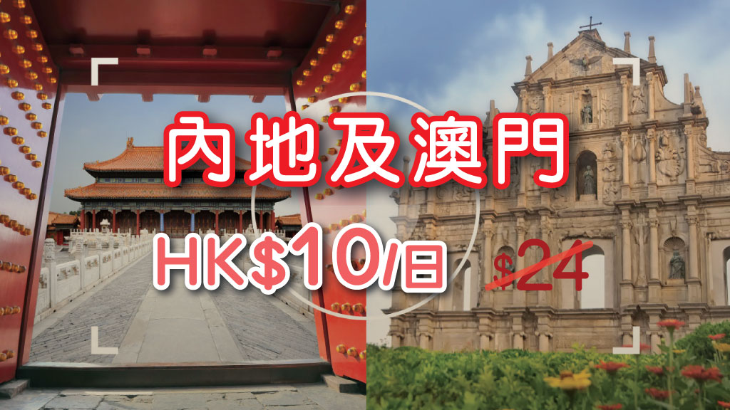 「內地及澳門」外遊數據日費優惠價只係HK$10/日!同一個日費仲可以同一日玩晒兩地!