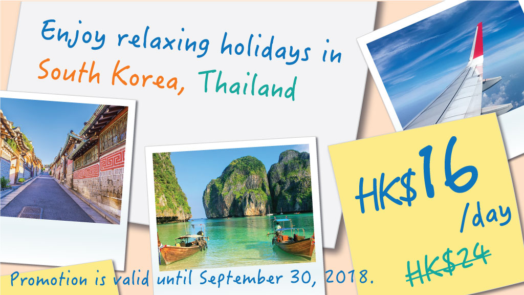 Freely enjoy data roaming for just HK$16 per day to share once-in-a-lifetime moments of your holidays in South Korea and Thailand. A Day Pass is only deducted when you use mobile data on that day. The consecutive use of multiple Day Passes is not necessary! It meets your needs for great South Korean trips for shopping and even reaching the hottest stars. You can also enjoy spas for relieving pressure in Thailand.