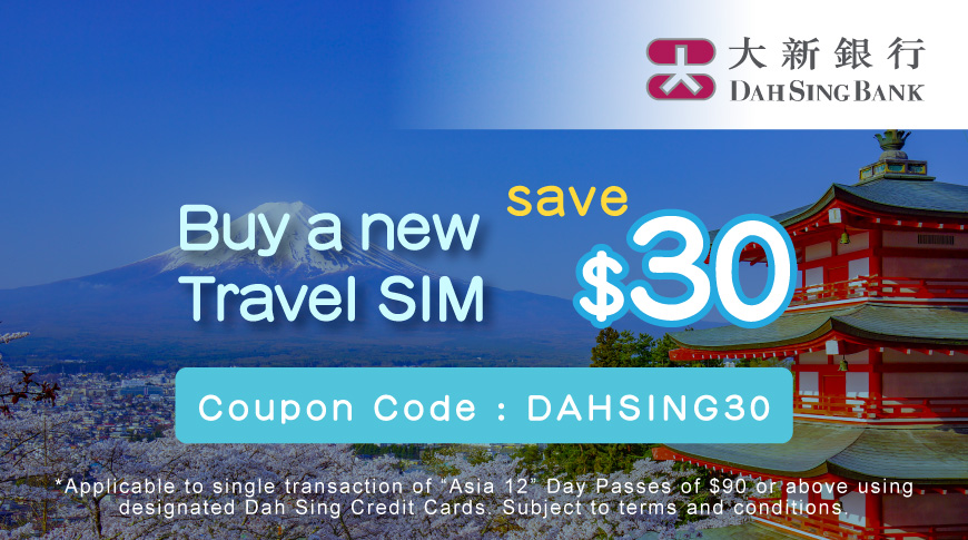 Enjoy HK$30 instant discount when you spend HK$90 or above on “Asia 12” Day Passes for a new Travel SIM in a single purchase, apply the coupon code “DAHSING30” and pay with a designated Dah Sing Credit Card.