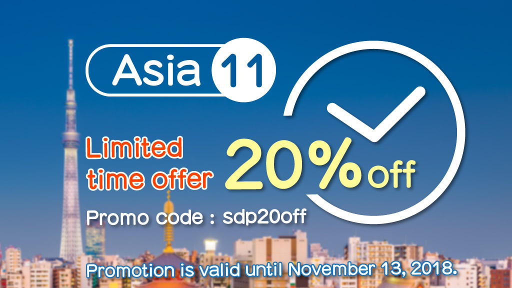 Enjoy special offers on purchasing Day Passes for 11 hot travel destinations – Japan, South Korea, Taiwan, Thailand, Macau, Singapore, Malaysia, Indonesia, Bangladesh, Cambodia & Sri Lanka. Get up to 20% discount to buy “Asia 11” Day Passes for 5 days or above by inputting the promotion code “sdp20off”.