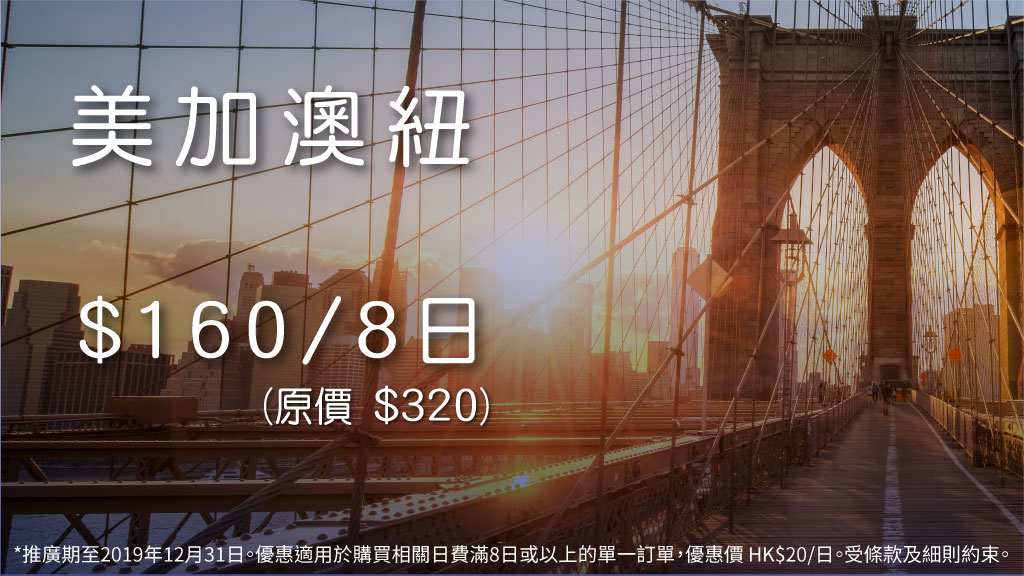 - 優惠適用於購買相關日費滿8日或以上的單一訂單,優惠價 HK$20/日。推廣期至 2019年12月31日。