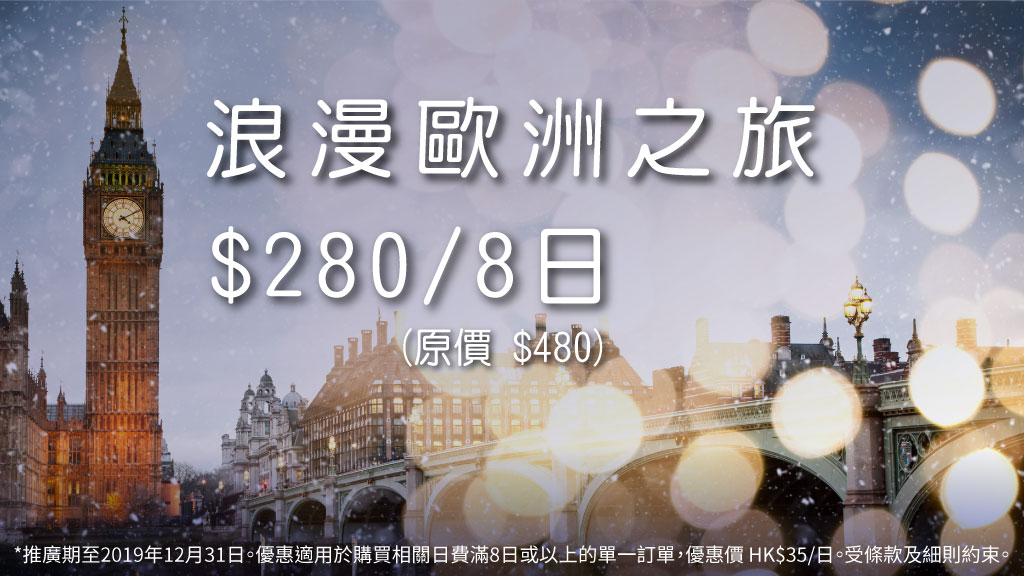 - 優惠適用於購買相關日費滿8日或以上的單一訂單,優惠價 HK$35/日。推廣期至 2019年12月31日